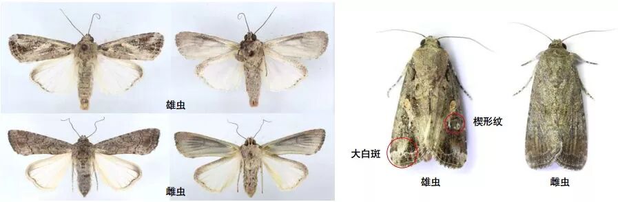 成虫:翅展 32 ~ 40m m , 前翅深棕色,后翅白色,边缘有窄褐色带。雌蛾前翅呈灰褐色或灰色棕色杂色,具环形纹和肾 形纹,轮廓线黄褐色;雄蛾前翅灰棕色,翅顶角向内各具一大白斑,环状纹后侧各具一浅色带自翅外缘至中室,肾形纹内侧各具一白色楔形纹。